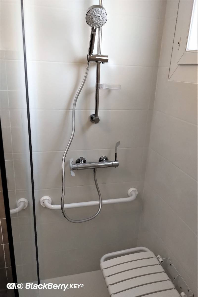 L'aménagement de la douche a receveur extra plat a été enrichi d’une robinetterie thermostatique à levier démultiplier qui facilite la préhension , ainsi que d’un siège de douche rabattable et de barres de maintien.