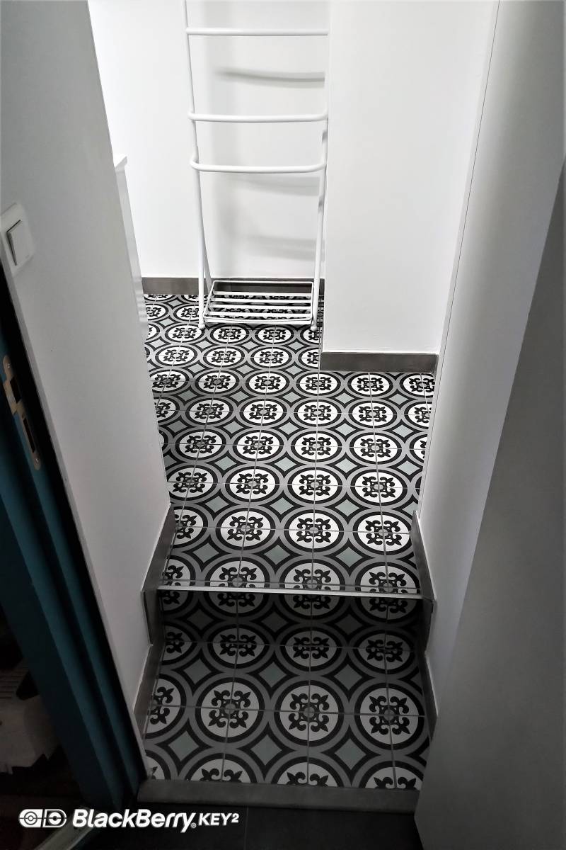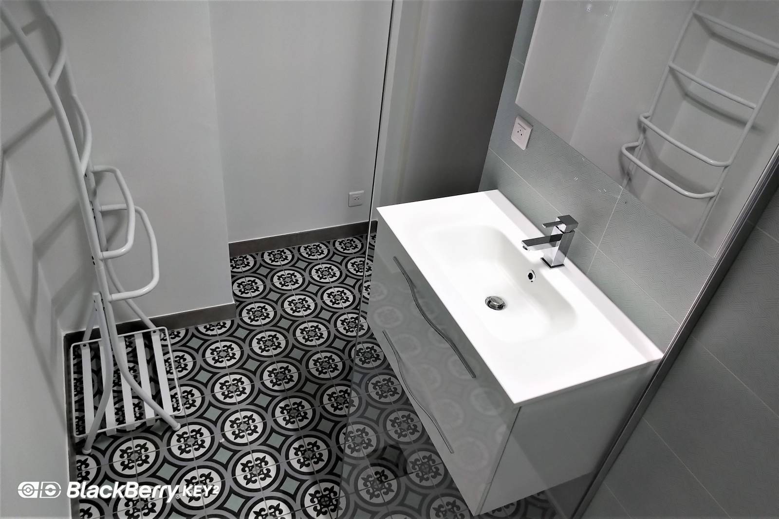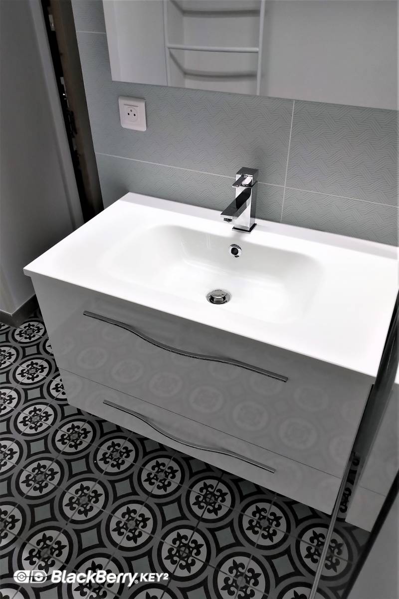 L'ensemble du carrelage de la pièce à été remplacé par des carreaux de ciment ce qui permet d'apporter une touche d'originalité et de modernité à la salle de bain.