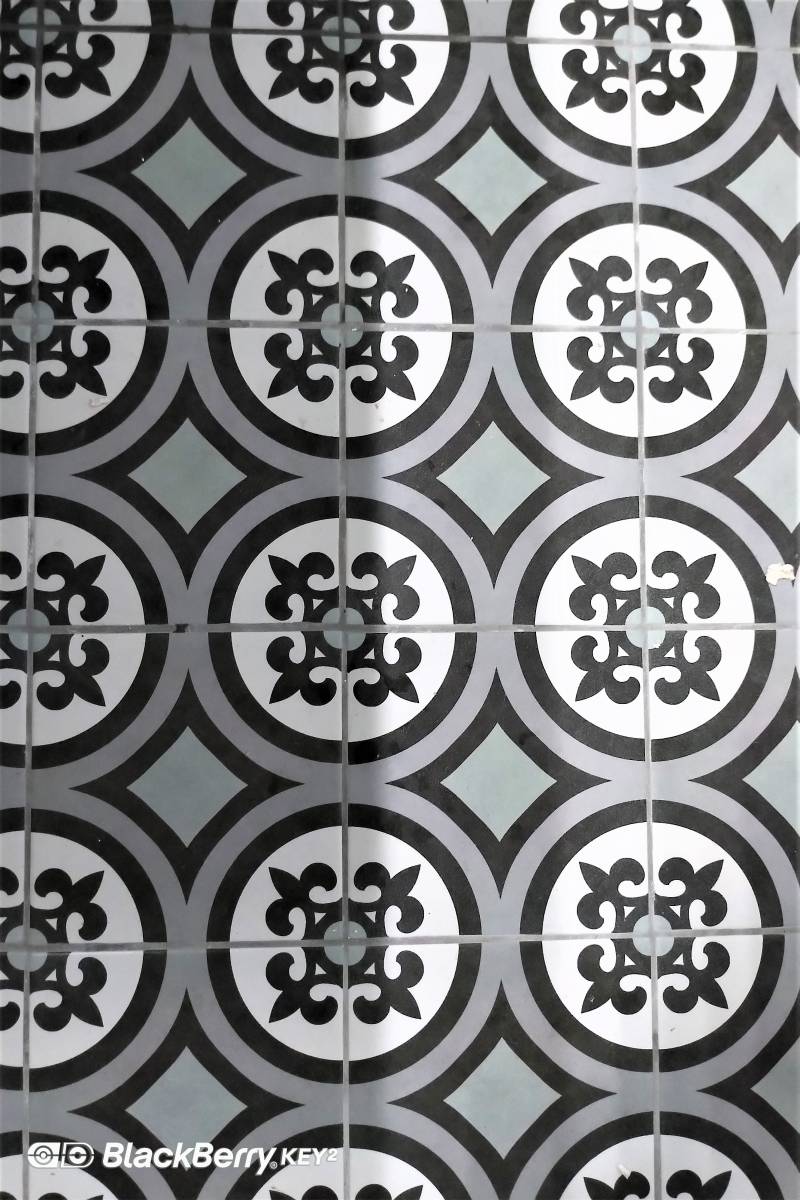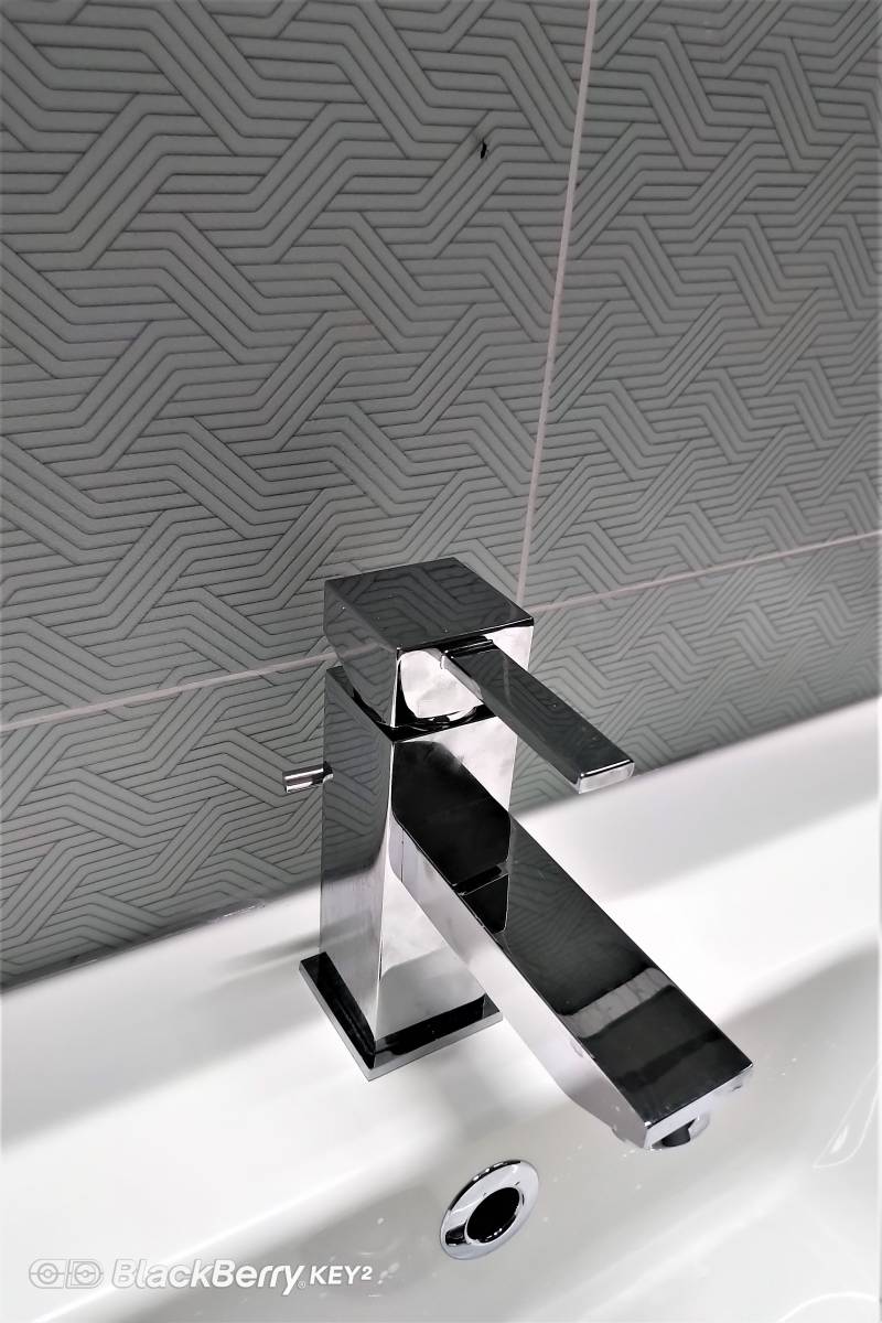 Une faïence bleu sérigraphié a été installé sur l'ensemble des murs, rappelant les nuances des carreaux de ciment au sol. Un primaire d'étanchéité un été appliqué en dessous de la faïence avant pose.