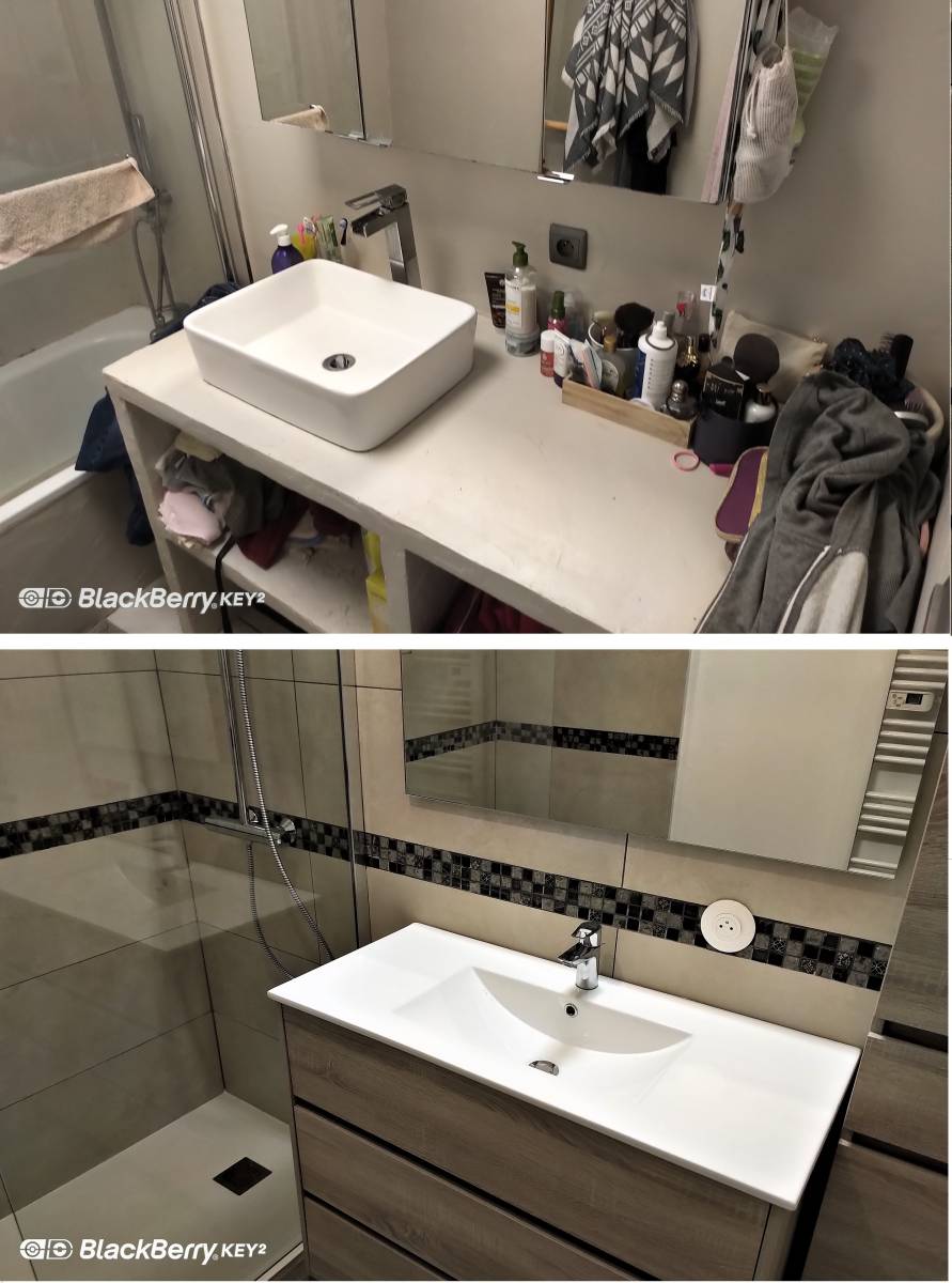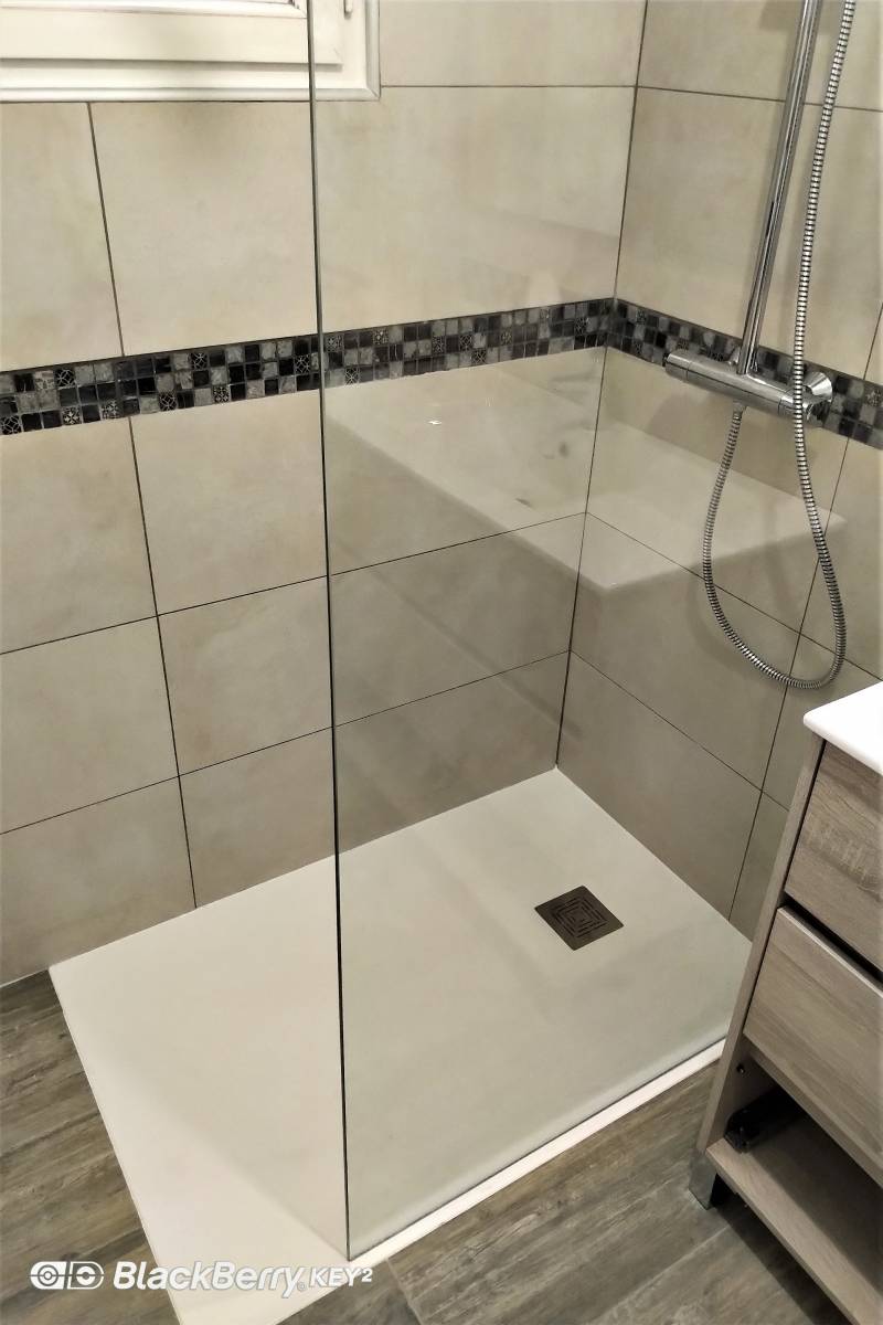 L’agencement de la salle de bain avec un receveur extra plat encastré en lieu et place de la baignoire nous a permis de redonner un sentiment d’espace à cette petite salle de bain.