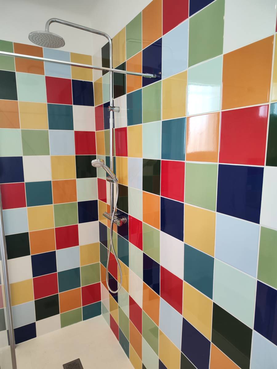 Nous avons posé une faïence multicolore en 20x20, chaque carreau de couleur différente a été posé de façon aléatoire, Elle apporte du dynamisme et une touche déco unique.