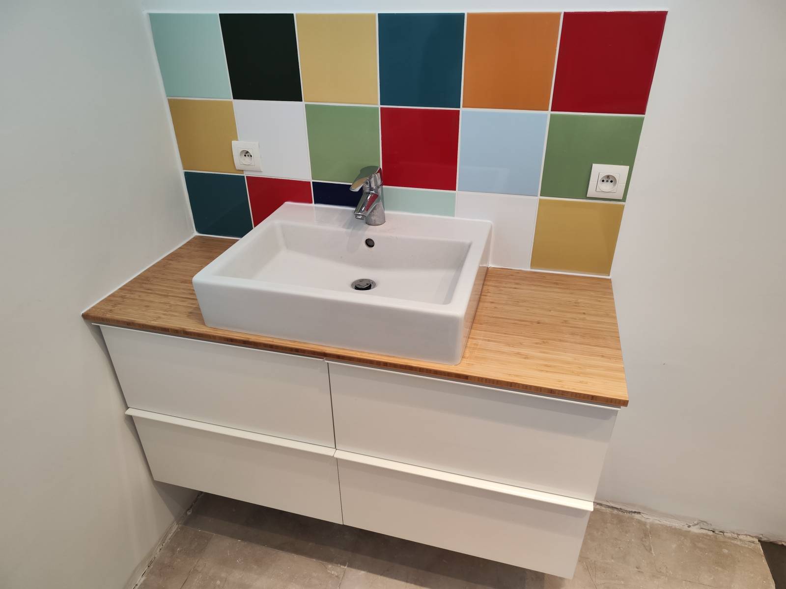 Pour finaliser cette réalisation à Montpellier, nous avons posé un meuble avec un plan de travail bambou qui s’associent à la perfection avec la crédence multicolore dans cette salle de bain qui se veut ici tonique et design.